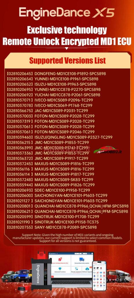 EngineDance X5 sblocca da remoto le seguenti centraline MD1 per camion bloccate (100 $ per lo sblocco a centralina).